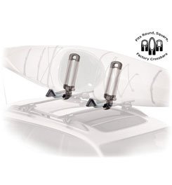 - Rooftop kayak carrier with J-cradle design that holds boat on its side